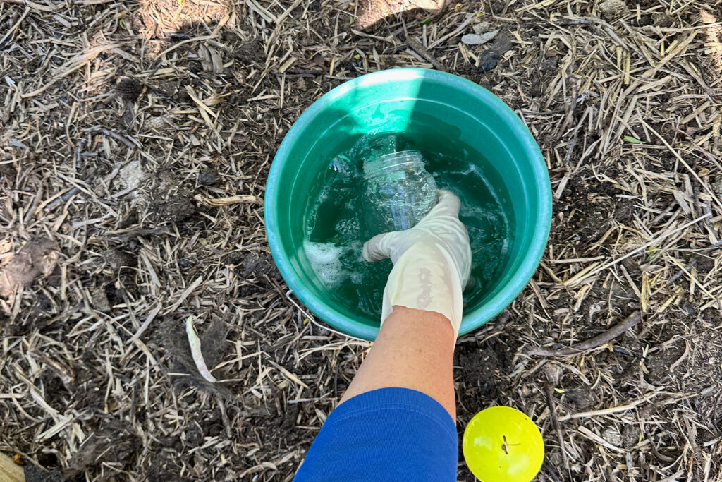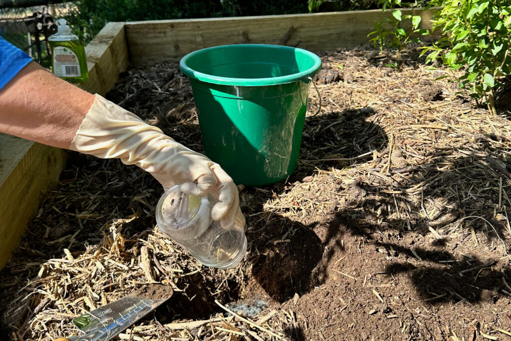 Now, with your bucket of water beside you, take your trap and remove the lid being careful not to spill the contents. If the trap needs water, you can dip it in the bucket and swirl to loosen up the flies, and then dump the contents in the hole. Quickly submerge the trap in the bucket of water and give it a good swish. You can then pour this water into the hole and backfill with soil and/or compost materials. Once well covered, there should be no noticeable smell.