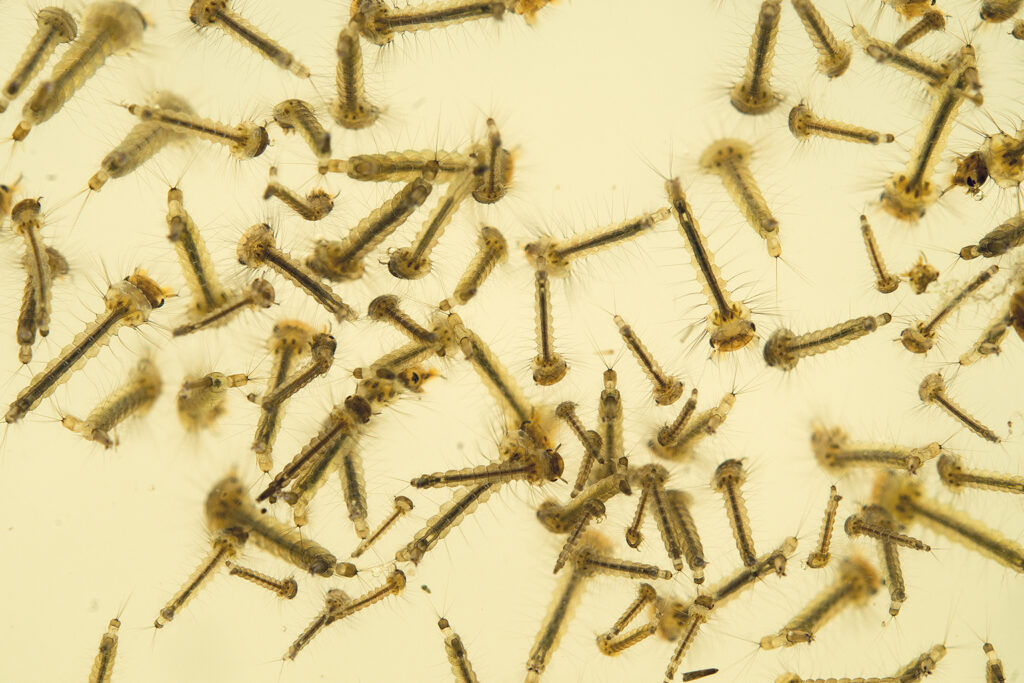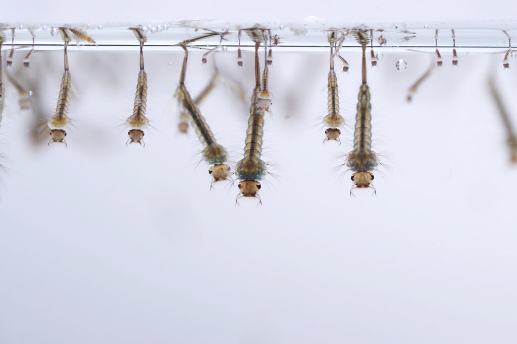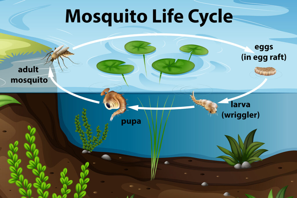 Mosquitoes begin their life as eggs laid in or near standing water, where they hatch into larvae. These larvae, commonly known as wrigglers, swim around in the water with a vigorous side to side motion, breathing at the water’s surface and feeding on organic matter in the water.